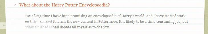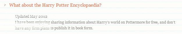 ฉันรู้สึกเพลิดเพลินที่ได้แบ่งปันข้อมูลเกี่ยวกับโลกของแฮร์รี่ พอตเตอร์ ในเว็บไซต์ POTTERMORE โดยที่แฟนๆ ไม่ต้องเสียเงิน และฉันไม่มีแผนที่จะจัดพิมพ์ “สารานุกรมแฮร์รี่ พอตเตอร์” ในรูปแบบหนังสืออย่างแน่นอน