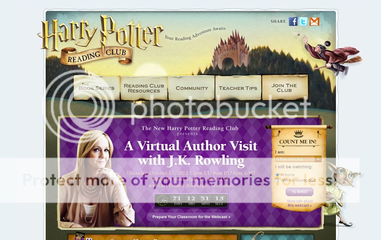 ในงานนี้ การเปิดตัวเว็บไซต์ “Harry Potter Reading Club” ได้จัดให้มีโอกาสพิเศษ ที่แฟนๆ หนังสือแฮร์รี่ พอตเตอร์ จะได้พบกับนักเขียนเจ้าของผลงาน เจ.เค.โรว์ลิ่ง ผ่านระบบ WebChat เพื่อเปิดเว็บไซต์แก่นักอ่านรุ่นเยาว์ ในวันที่ 11 ตุลาคม เวลา 12:00pm ET / 9:00 am PT / 5:00pm GMT หรือตามเวลาไทย คือวันที่ 12 ตุลาคม เวลาเที่ยงคืนครับ โดยเจ.เค.โรว์ริ่ง จะเป็นเจ้าภาพในการเปิดงาน จากบ้านของเธอในเอดินเบิร์ก สกอตแลนด์ เพื่อตอบคำถามนักอ่านรุ่นเยาว์ นี่เป็นครั้งแรกหลังจากปี 2007 ที่เธออ่านหนังสือ แฮร์รี่ พอตเตอร์ กับเครื่องรางยมทูต ที่นิวยอร์ค